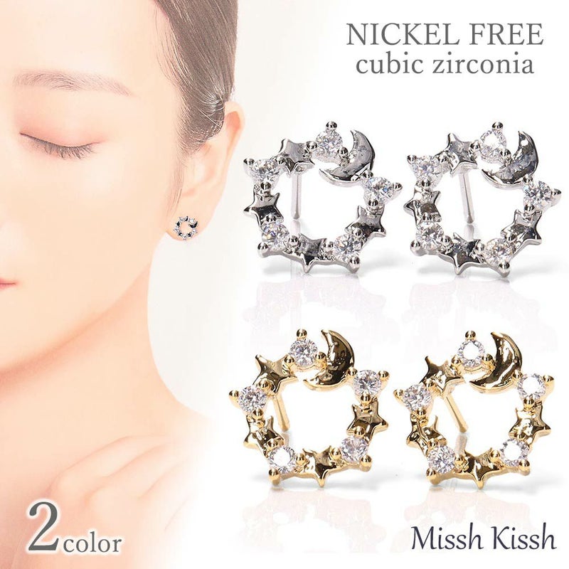 シンプルで美しいキュービックジルコニアを使用したピアスです。ダイヤモンドにもひけをとらない人気のジルコニアは、見る角度によってキラキラと美しく輝きます。 月と星をモチーフに、全体はサークルの形になっているデザイン。小さいサイズのシンプルなピアスなので、オフィスから普段使い、フォーマルの場まで幅広く活躍してくれます。 素材は真鍮でニッケルフリーなのでアレルギーのある方にもお使いいただけます。 ※すべての方にアレルギーフリーを保証するものではございませんのでご注意ください