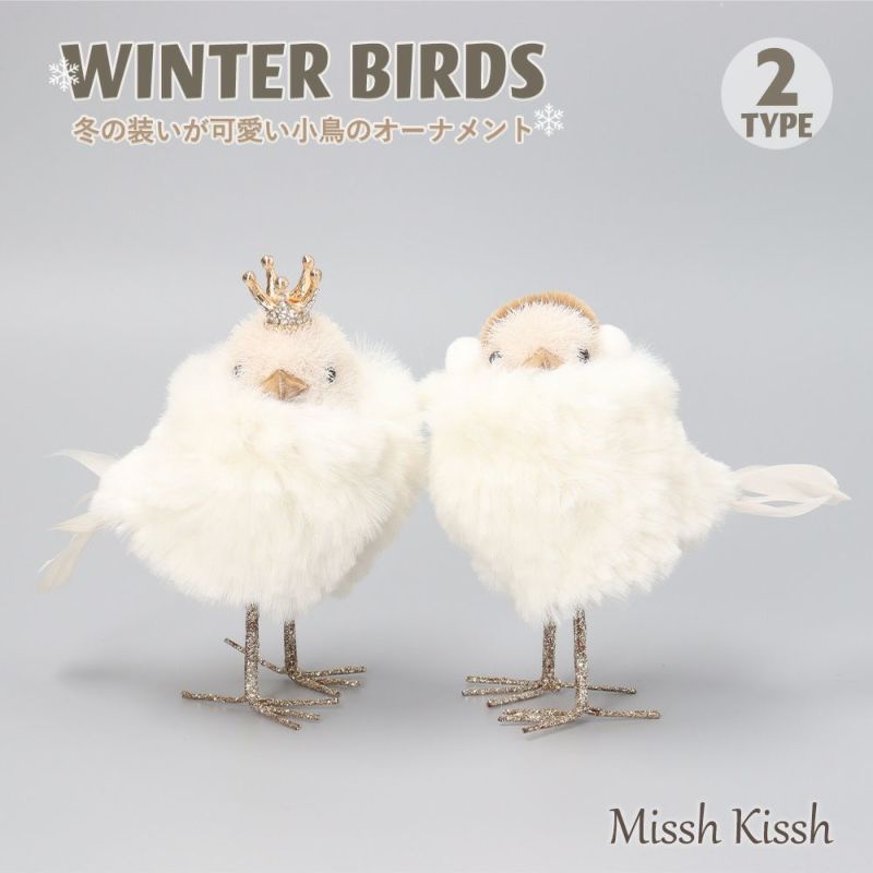 ふわふわの羽毛に包まれた姿は、まるで雪の妖精のよう。王冠をのせた小鳥とイヤーマフをつけた小鳥の2種類からお選びいただけます。