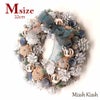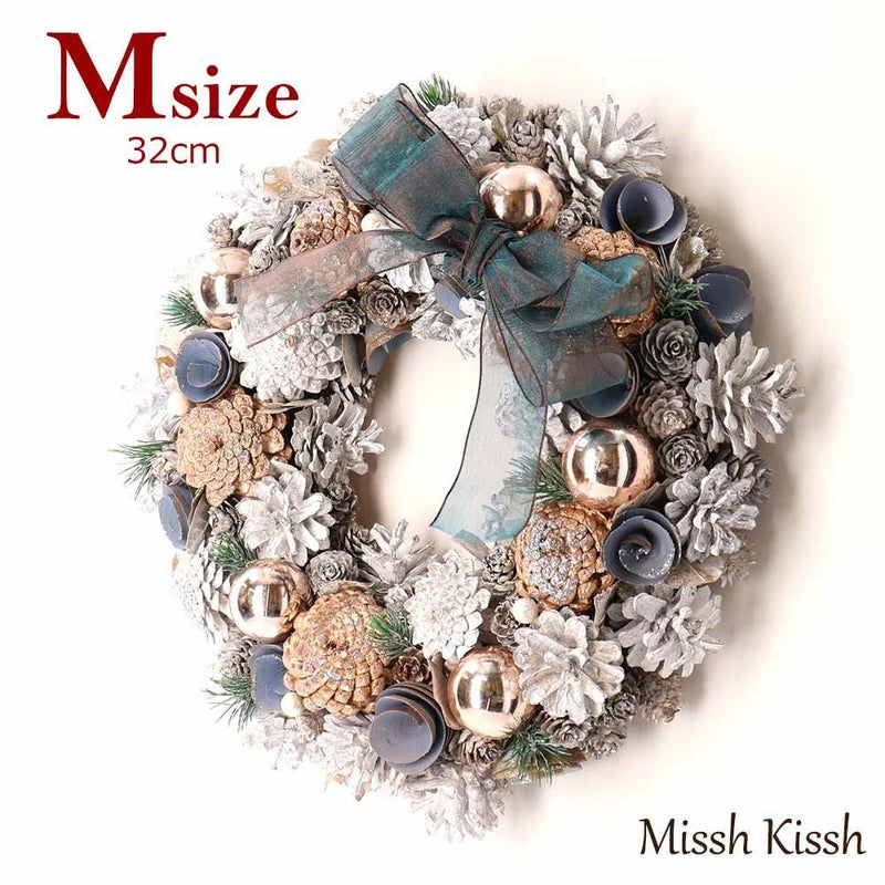 ナチュラルな素材を使用したオーガンジーのリ大きなボンが印象的な大人っぽいリースです。 2種類のまつぼっくりと黒いお花、ゴールドのボールや木の実でゴージャスに仕上げています。 店舗等の飾りにもおすすめです。 |