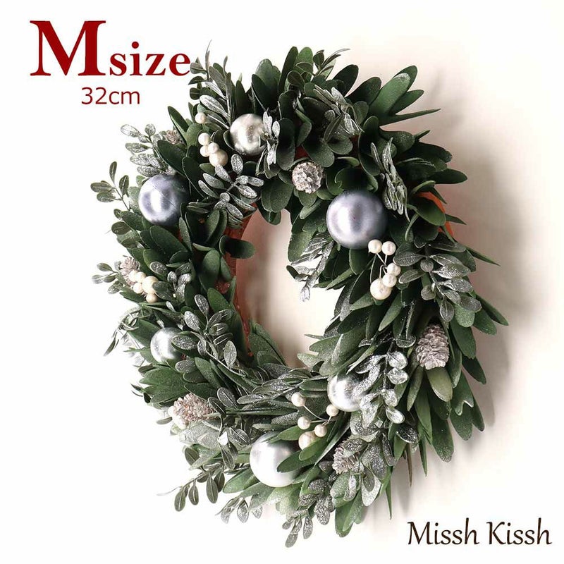| 特徴 | シルバーのボールが印象的なグリーンリーフをふんだんに使用した大人っぽいデザインのリースです。 |