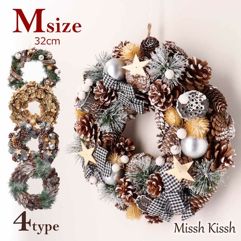 【A】白いリンゴや松ぼっくりと樹皮を巻いたデザインがスタイリッシュなリースです。 【B】ゴールドの花びらが映えるデザインのリースです。綺麗にインテリアを飾ります。 【C】ギンガムチェックのリボンとゴールドスターの飾りにスノーパウダーをかけた可愛らしいリースです。 【D】松ぼっくりや松の葉がスタイリッシュな自然の素材をたっぷり使った大人っぽいリースです。 |