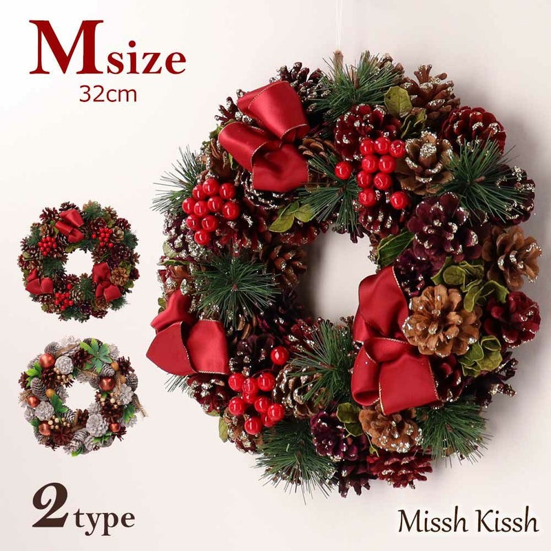 【A】松ぼっくりとグリーン、赤い木の実と赤いリボンがかわいいクリスマスカラーのリースです。 【B】松ぼっくりなどのナチュラル素材を使用したゴールドのボールが印象的なリースです。 |