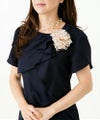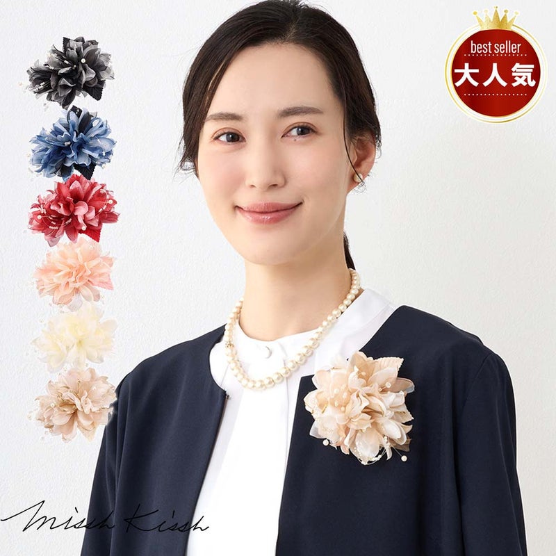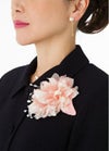 透け感のあるオーガンジーの花びらと光沢のあるサテンの花びらを重ねた華やかなコサージュです。
