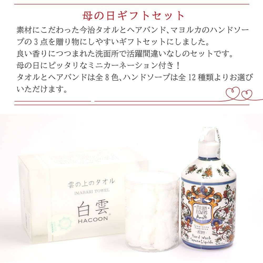 他の画像を見る オリジナルギフトセット La Maioliche + 白雲 (ハンドソープ/ハンドクリーム/フェイスタオル2枚)ギフトセット ¥ 5,500 税込 会員特別価格 ¥ 5,225 税込 在庫切れ カートに入れる お気に入りに登録する
