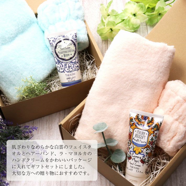 他の画像を見る オリジナルギフトセット La Maioliche + 白雲 (ハンドクリーム/ヘアバンド/フェイスタオル)ギフトセット ¥ 4,180 税込 会員特別価格 ¥ 3,971 税込 在庫切れ カートに入れる お気に入りに登録する