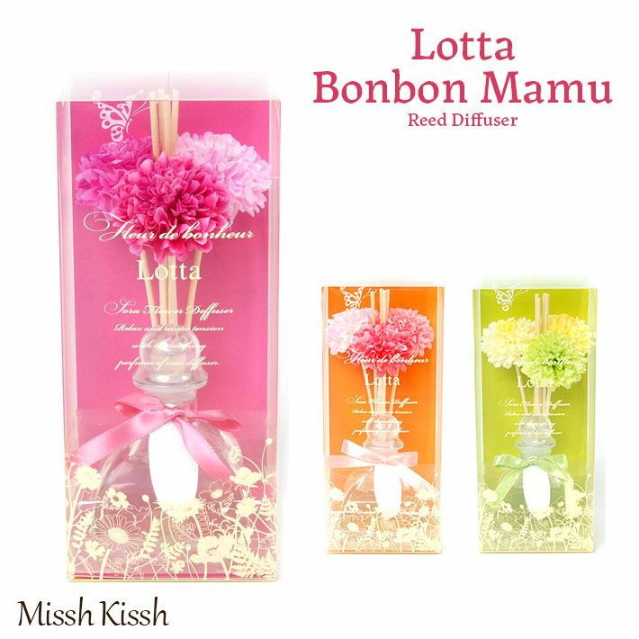 | 特徴 | ボンボンマムのリードディフューザーです。 造花・香りの種類は3種類。 リードディフューザーとしてご使用いただいた後もお部屋のインテリアとしてご利用いただけます。 日本製 |