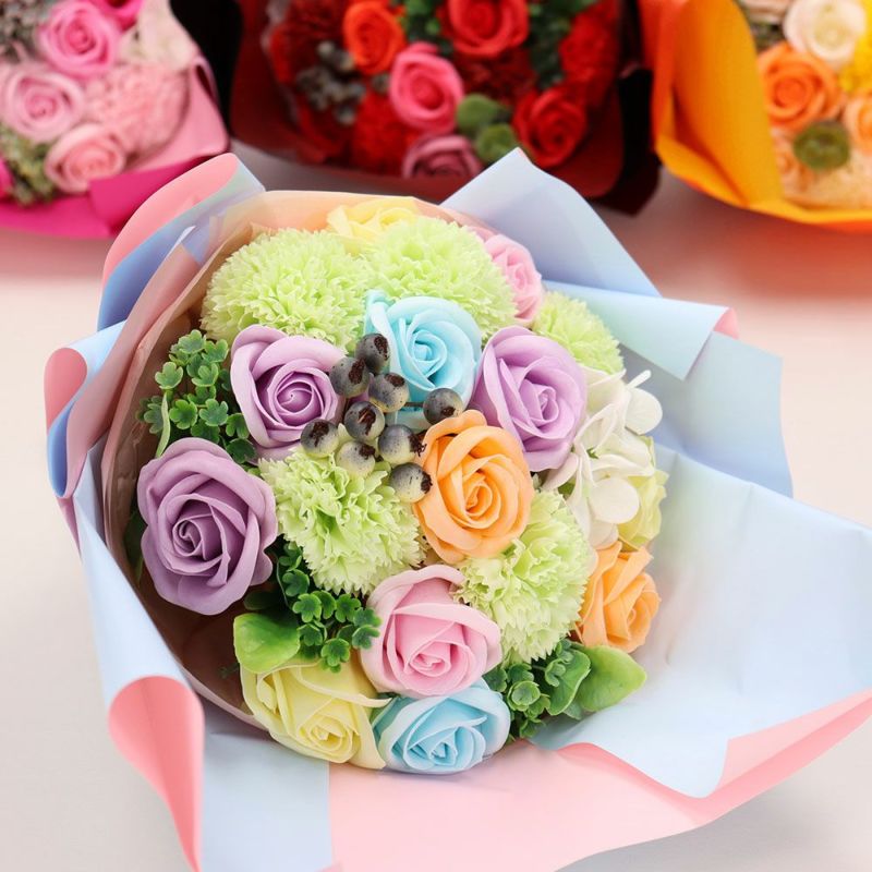 こちらはアクリル製のバルーンにバスフレグランスを使用して花束に仕上げました。